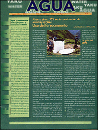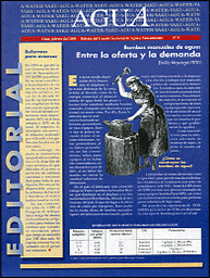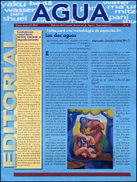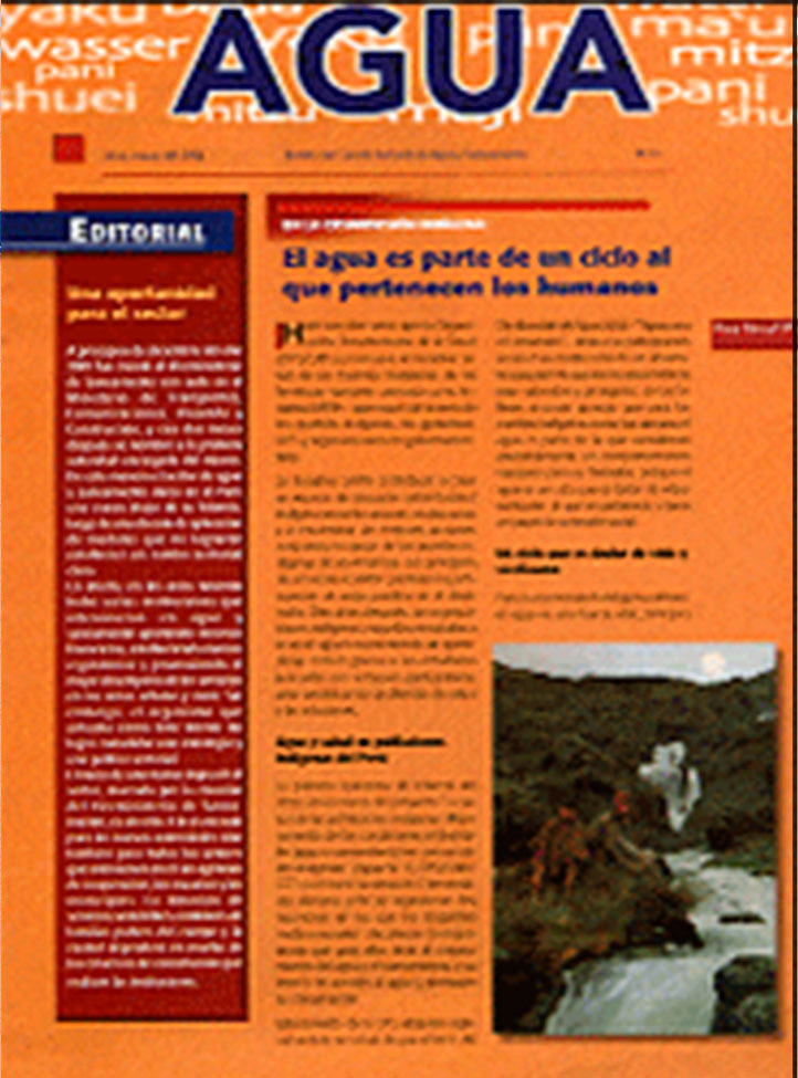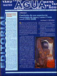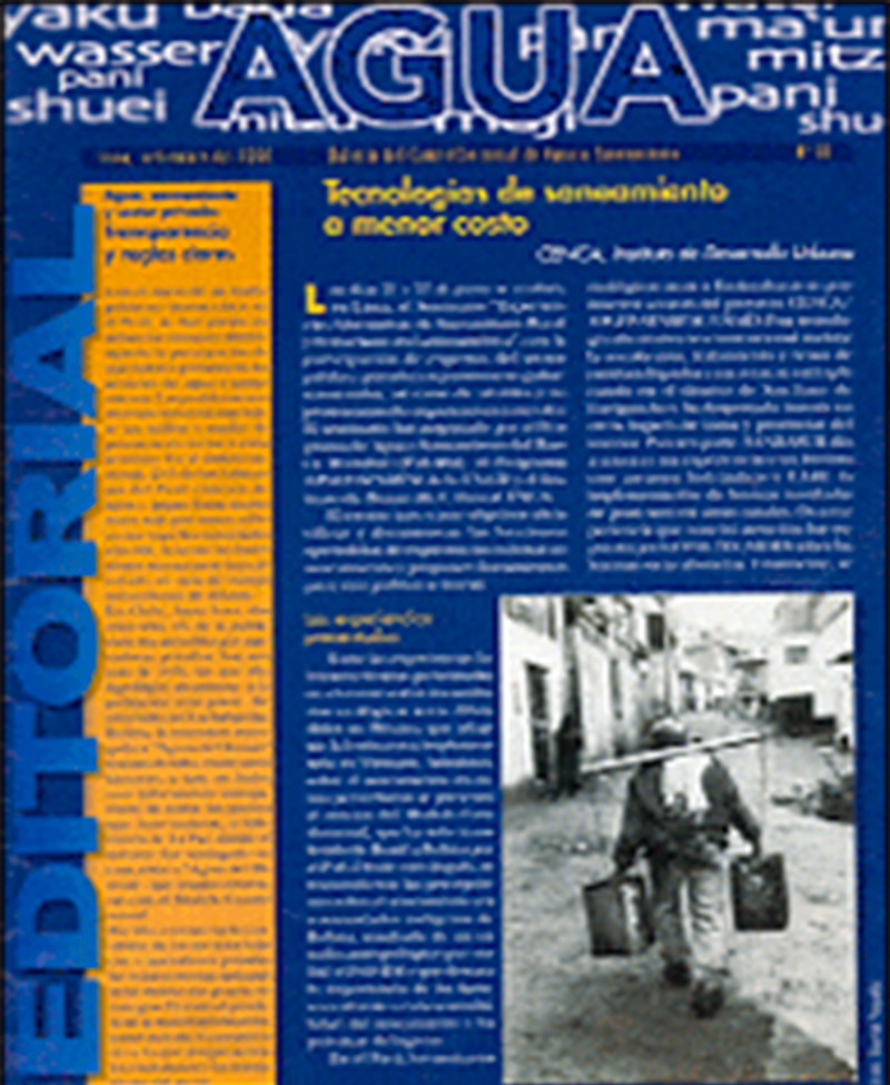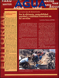 La revista AGUA es una publicación trimestral editada por el Comité Sectorial de Agua y Saneamiento, conformado por DNS MVCS, CEPIS- OPS-OMS, SUNASS, DIGESA – MINSA, PAS PNUD-Banco Mundial, ACDI, AGUASAN COSUDE, UGP PRONASAR, SANBASUR, CARE-PROPILAS, CENCA, CESAL, SUM CANADA, APDES, PLAN INTERNACIONAL, INTERVIDA-SOLARIS, PRISMA, KALLPA, SER, CONSORCIO CASMA. Su objetivo es comunicar las iniciativas del sector, difundir puntos de vista y brindar información sobre capacitación y recursos humanos. Integrar el Comité es una posibilidad abierta para las instituciones que lo deseen.
